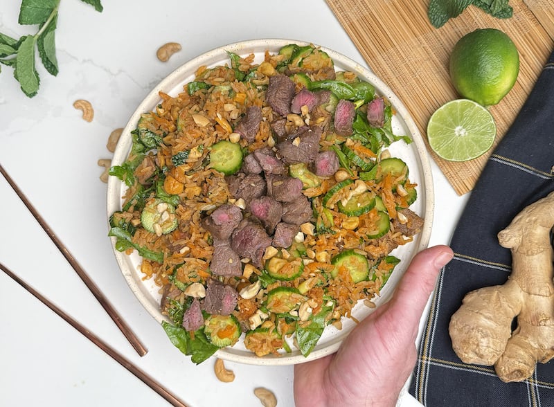 Consulter la recette complète de salade de riz croustillant et boeuf au gingembre à la friteuse à air par Max L’Affamé.