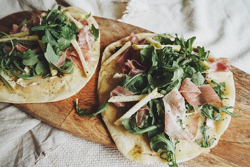 Pizza sur pain naan avec compote de pomme, brie et prosciutto