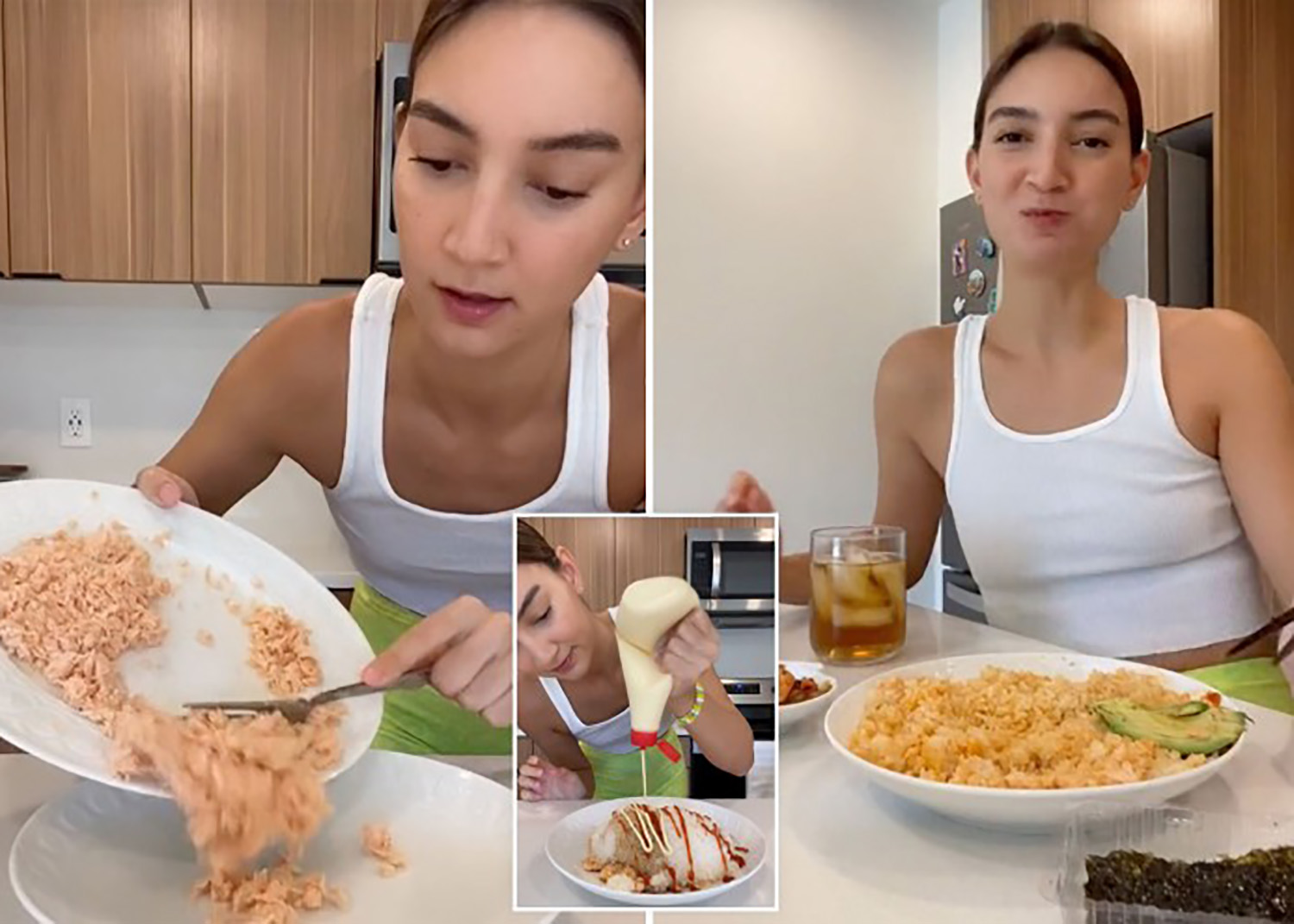 Ce qu’on voit dans la vidéo, c’est qu’Emily mange son bol un peu comme un rouleau ou un «wrap» de sushi: elle dépose une tranche d’avocat au milieu, elle recouvre cette dernière avec une feuille d’algue et elle « saisit » en même temps du riz au saumon dans sa feuille d’algue pour compléter sa bouchée.