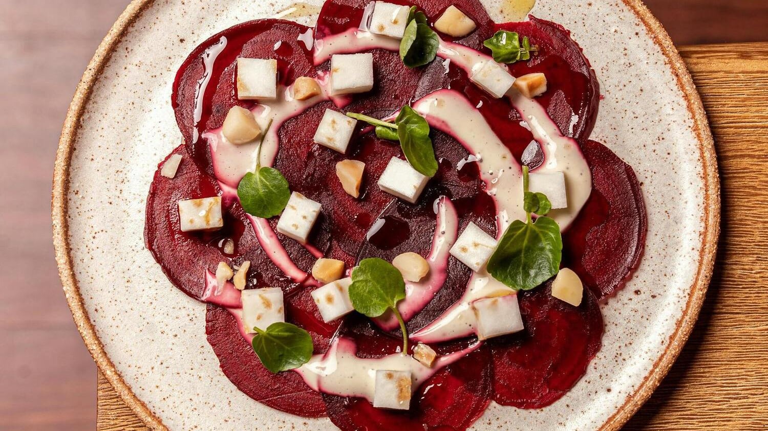 Ou bien, commencez le repas par un carpaccio de betteraves beau pour les yeux et bon dans la bouche. Pour une version encore plus simple, vous pourriez acheter des betteraves déjà cuites et pelées emballées sous-vide à l'épicerie.