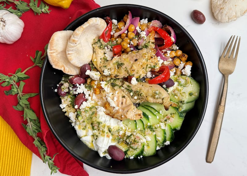 Consultez la recette de bol de poulet santé style méditerranéen.