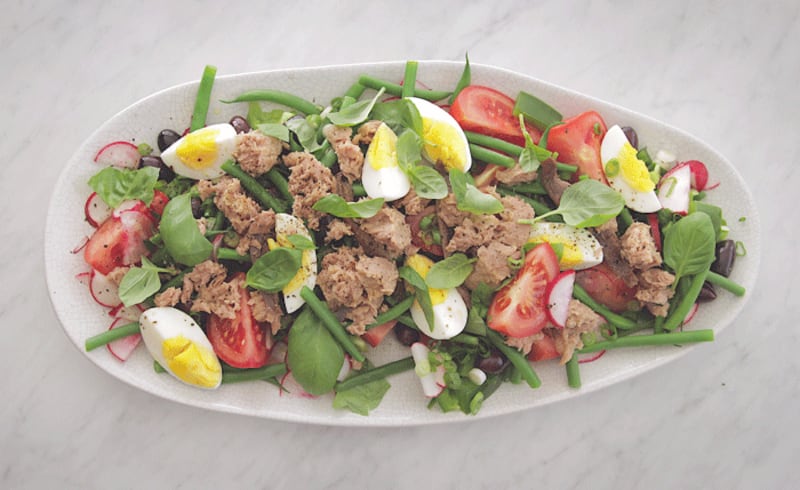 Une salade facile et savoureuse qu'on adore! Garnie de morceaux de thon, d'oeufs cuits durs et d'anchois, elle procure une bonne quantité de protéines.