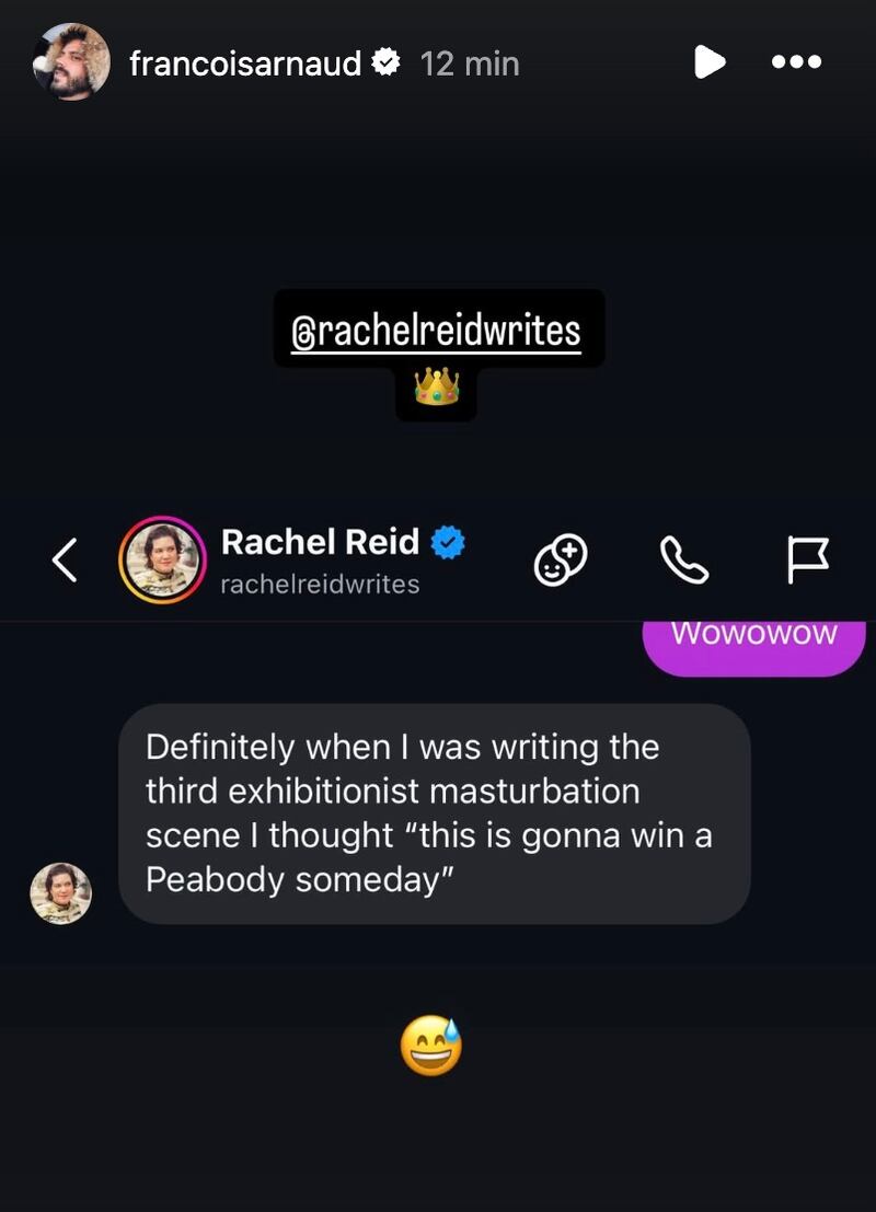 «Définitivement, quand j’écrivais la troisième scène de masturbation exhibitionniste, je me suis dit ‘cela va gagner un Peabody un jour’», lance Rachel Reid avec sarcasme.