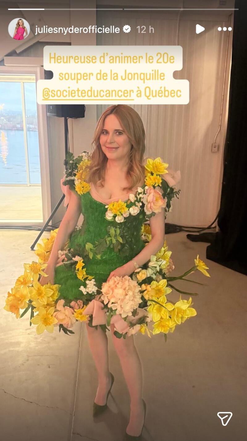 Julie Snyder a choisi un look spectaculaire pour une soirée bien spéciale, cette semaine. La célèbre animatrice et productrice animait le Souper de la jonquille au profit de la Société canadienne du cancer jeudi soir à Québec.