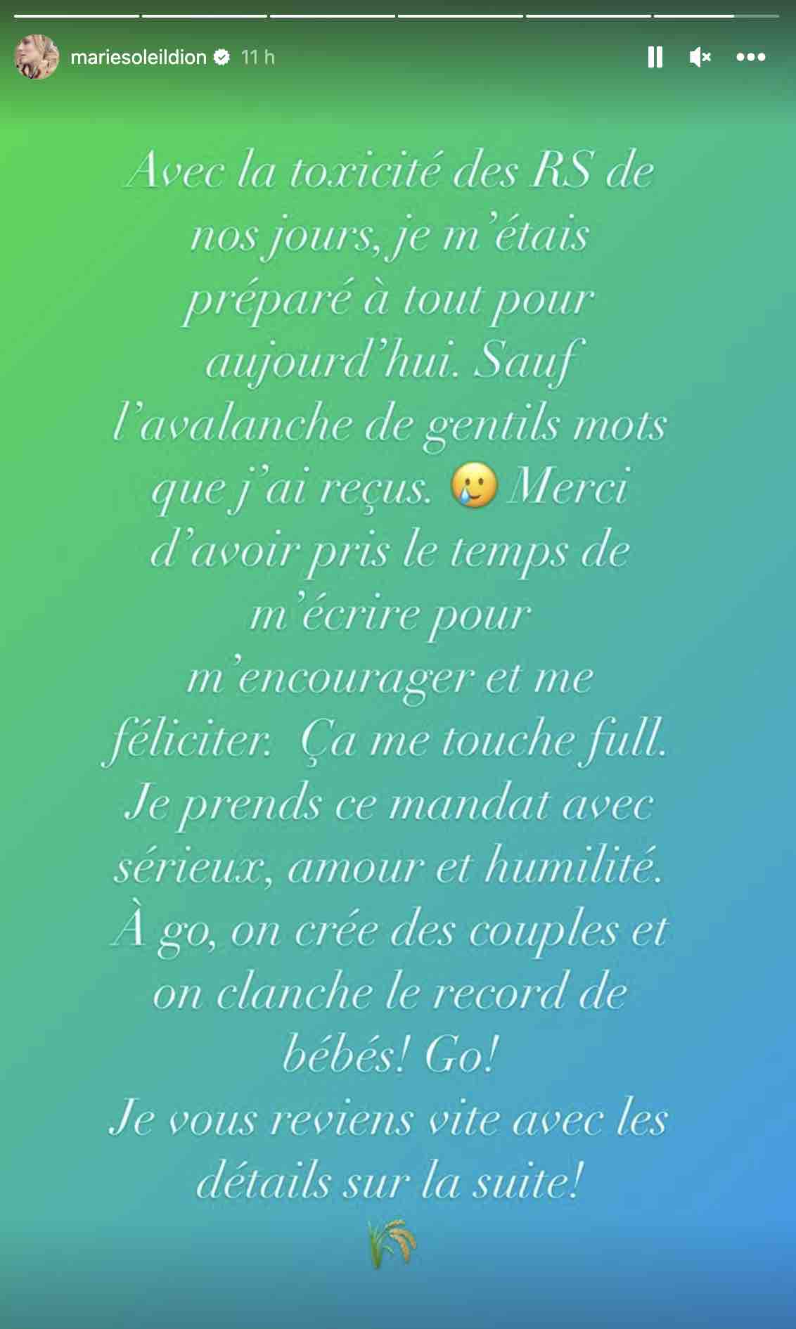 « Avec la toxicité des réseaux sociaux de nos jours, je m'étais préparé à tout pour aujourd'hui. Sauf l'avalanche de gentils mots que j'ai reçu. Merci d'avoir pris le temps de m'écrire pour m'encourager et me féliciter. Ça me touche full. Je prends ce mandat avec sérieux, amour et humilité. À go, on crée des couples et on clanche le record de bébés! Go! »