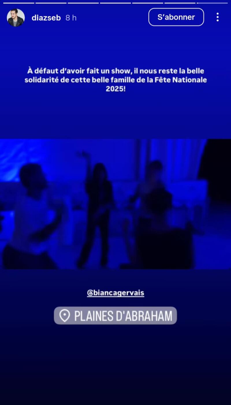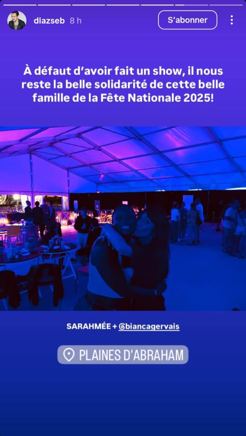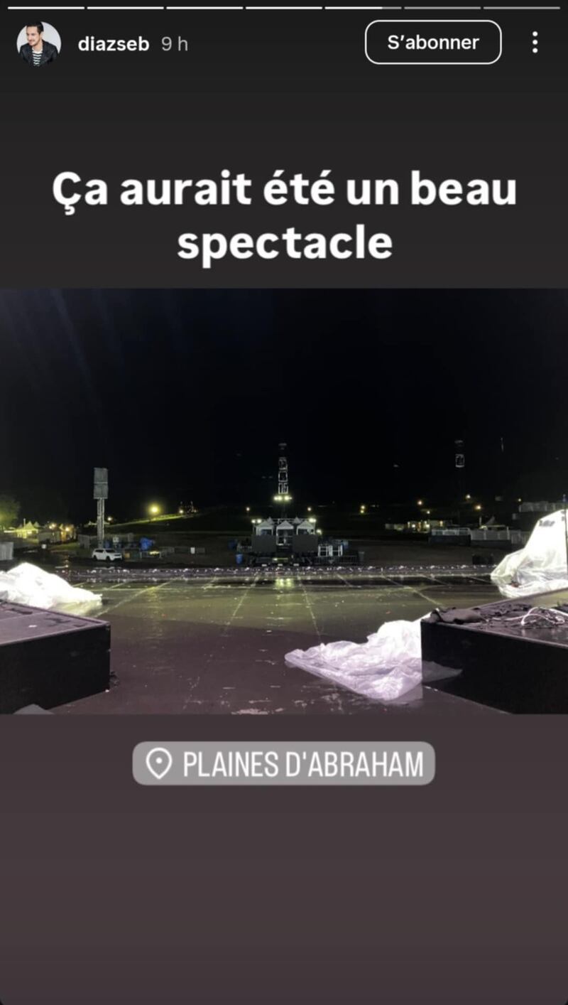 Sébastien Diaz qui devait animer le spectacle en compagnie de Bianca Gervais a partagé sur Instagram des photos et une vidéo en fin de soirée pour montrer les Plaines d’Abraham et la belle «solidarité» avec les membres de l’équipe du spectacle.