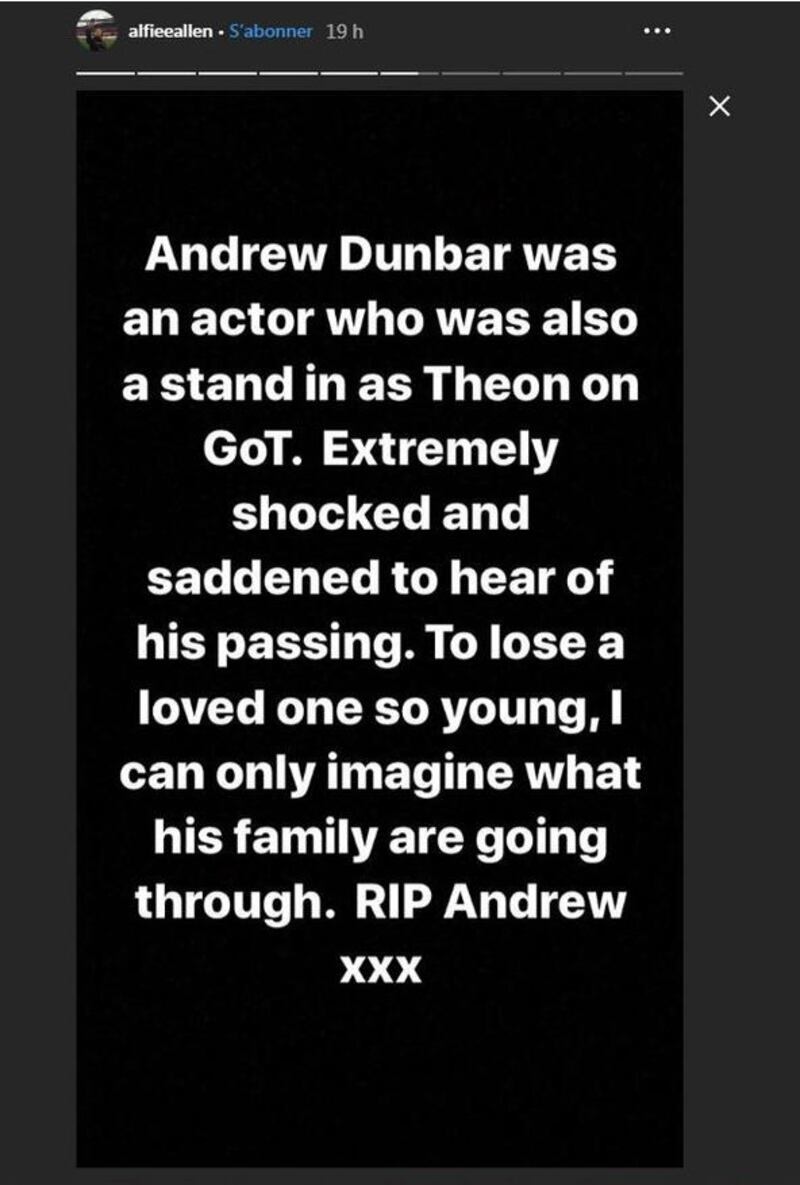 Alfie Allen a aussi partagé ses condoléances à la famille d'Andrew, encore ébranlé et sous le choc après avoir appris la terrible nouvelle.