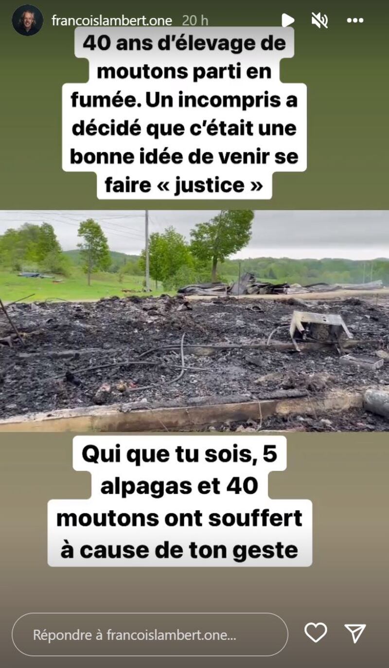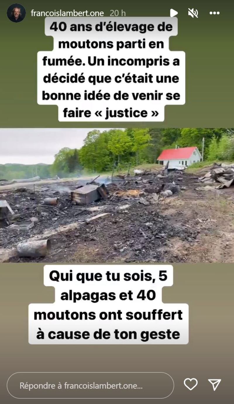 Sur Facebook, François Lambert a donné plus de détails sur l'incendie criminel qui s'est déclaré dans la bergerie de sa ferme à Notre-Dame-de-la-Paix, en Outaouais,