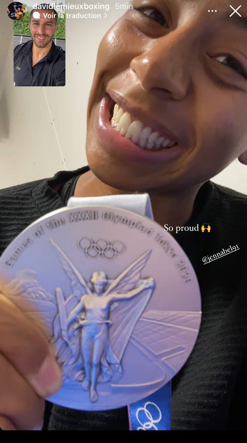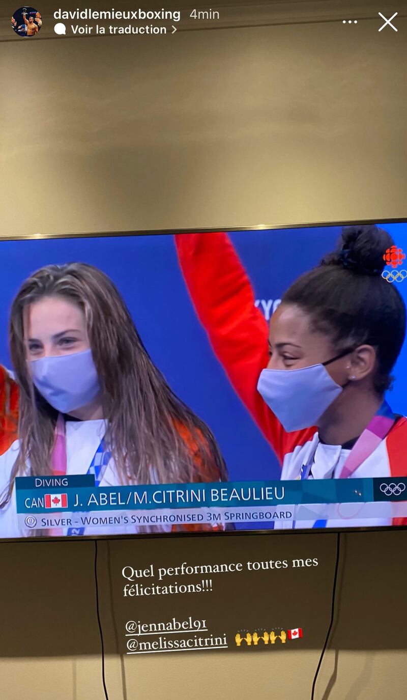 En direct du Québec, c'est le boxeur David Lemieux, amoureux de longue date de la plongeuse Jennifer Abel, qui profitait de la magie des technologies afin de féliciter sa tendre moitié pour tout le travail acharné qu'elle a fait dans les dernières années... ainsi que pour s'être mérité la médaille d'argent aux fameux Jeux olympiques de Tokyo.