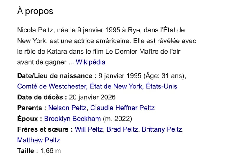 Pire encore: une fausse date de décès a été ajoutée sur le profil Wikipédia de l'actrice Nicola Peltz, présumant qu'elle soit décédée le 20 janvier 2026 à l'âge de 31 ans. La fausse information est restée en ligne plusieurs heures: