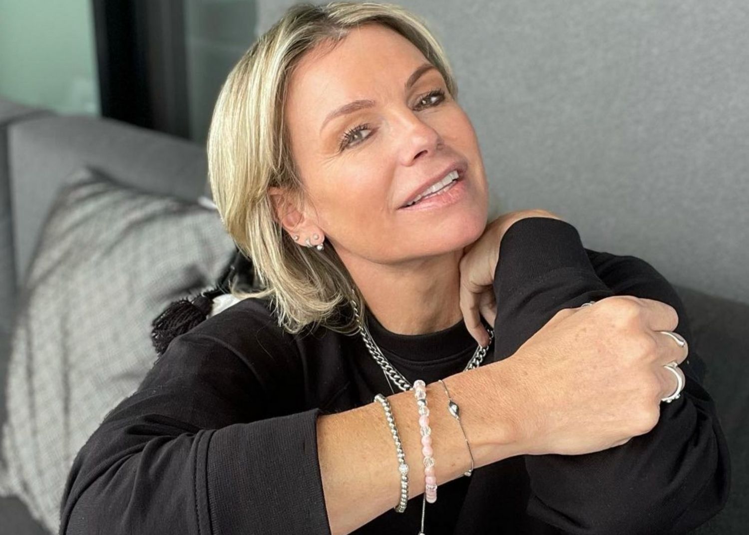 Avec la pièce centrale de son ensemble, Caroline Néron a enfilé un chemisier crème transparent accompagné d'une petite veste à manches longues du même ton.
