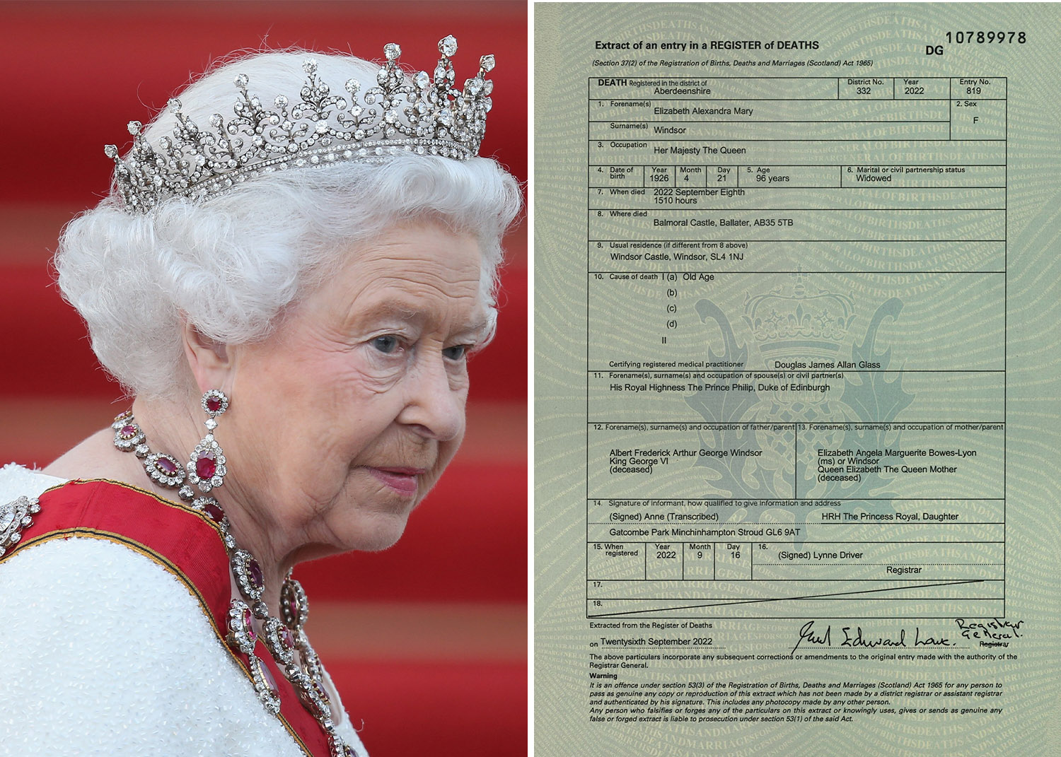 Le certificat de décès révèle que la monarque, qui avait 96 ans et 4 mois au moment de sa mort, est tout simplement décédée dû à son « âge avancé » (Old Age). Aucune autre cause n’a été énoncée, signifiant donc qu’Élizabeth, née en 1926, n’avait pas de maladie ou de problème chronique sous-jacent.