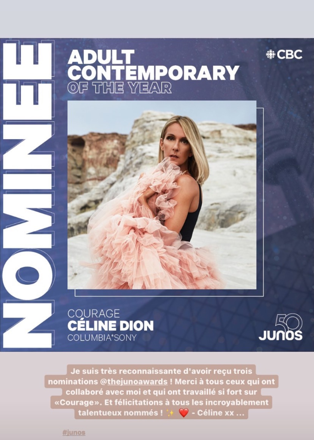 Céline Dion se dit « très reconnaissante » d'être nommée aux Junos 2021!