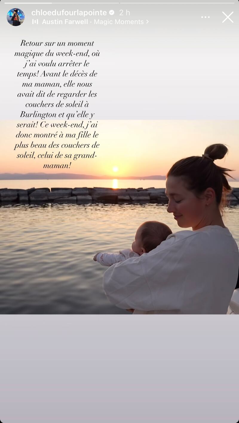 «Retour sur un moment magique du week-end, où j'ai voulu arrêter le temps! Avant le décès de ma maman, elle nous avait dit de regarder les couchers de soleil à Burlington et qu'elle y serait. Ce week-end, j'ai donc montré à ma fille le plus beau des couchers de soleil, celui de sa grand-maman.»