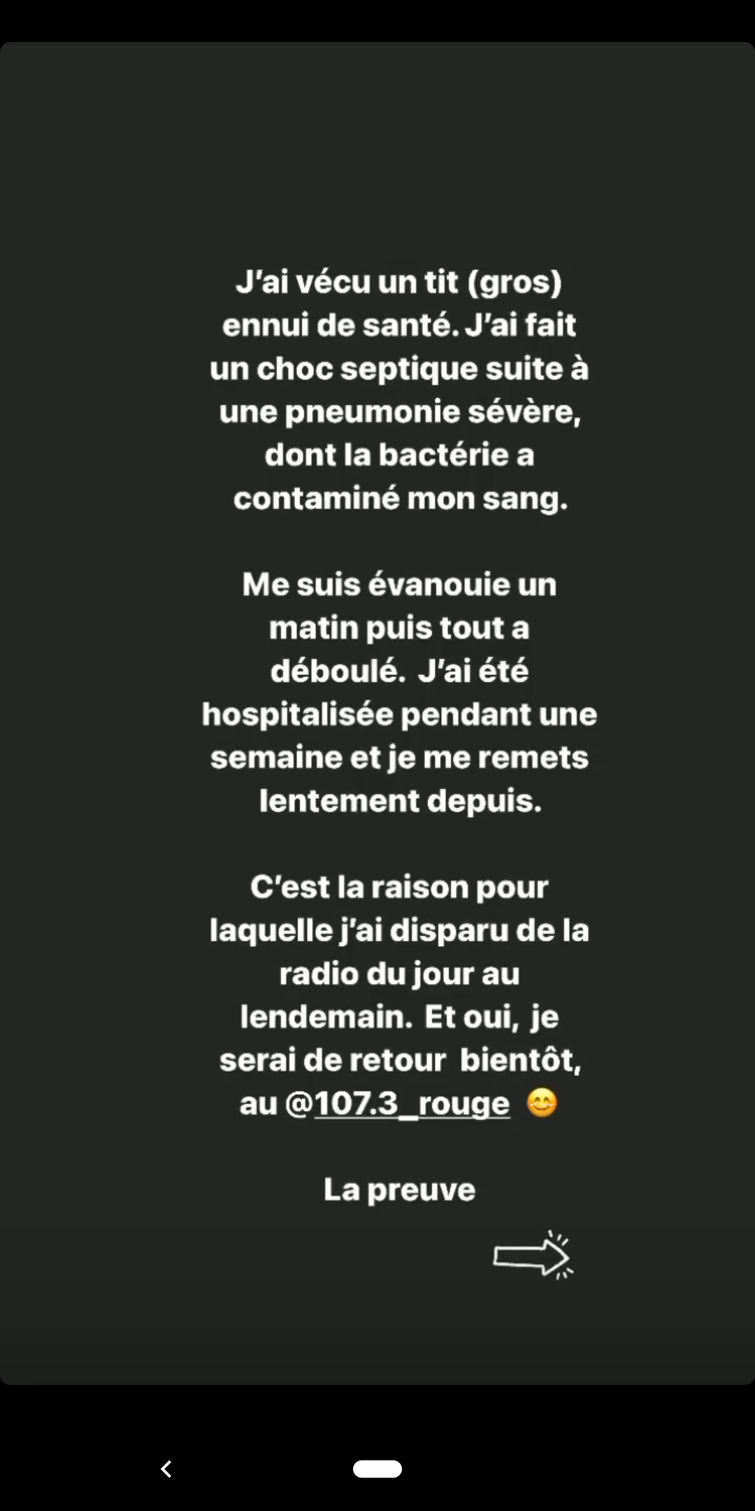 C'est la raison pour laquelle je suis disparue de la radio du jour au landemain. Et oui, je serai de retour bientôt au @107.3_rouge! »