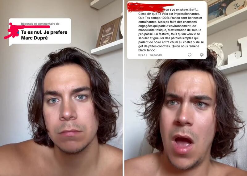 «Tu es nul, je préfère Marc Dupré» rapporte-t-il. Confus, il prend le temps de réfléchir et répond de façon pince-sans-rire: «Perso[nellement], moi aussi.»