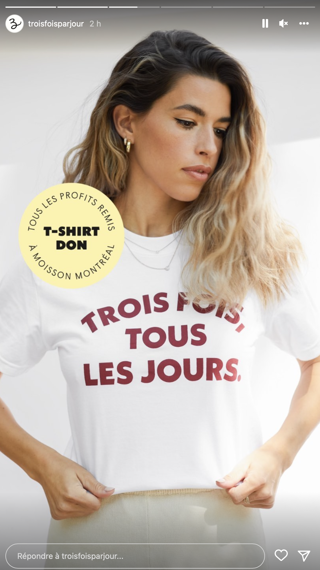 100 % des profits générés par la vente de nos t-shirts « Trois fois, tous les jours » leur seront versés.