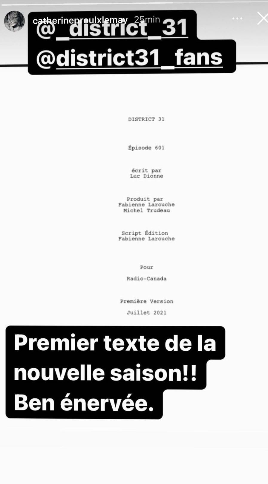 Dans une story Instagram, l'actrice Catherine Proulx-Lemay, qui incarne la sergent-détective Florence Guindon, a dévoilé une photo du scénario des nouveaux épisodes à tourner.