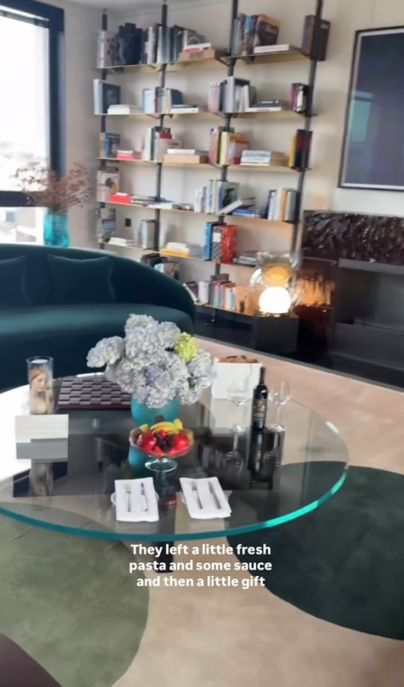 Elle a commencé à montrer le coin salon du logement qui offre une magnifique vue sur Milan. On peut y voir un mur de livre, un foyer, une grande télévision et de jolis divans.