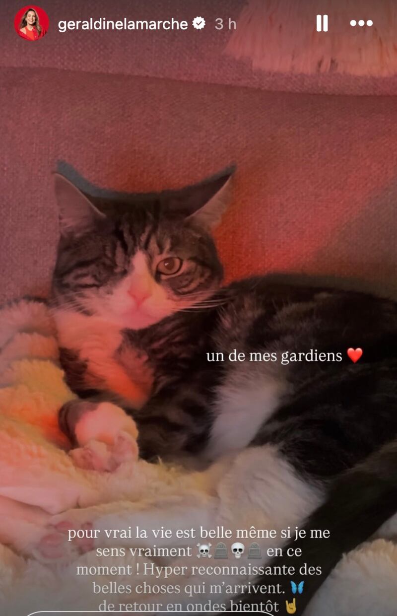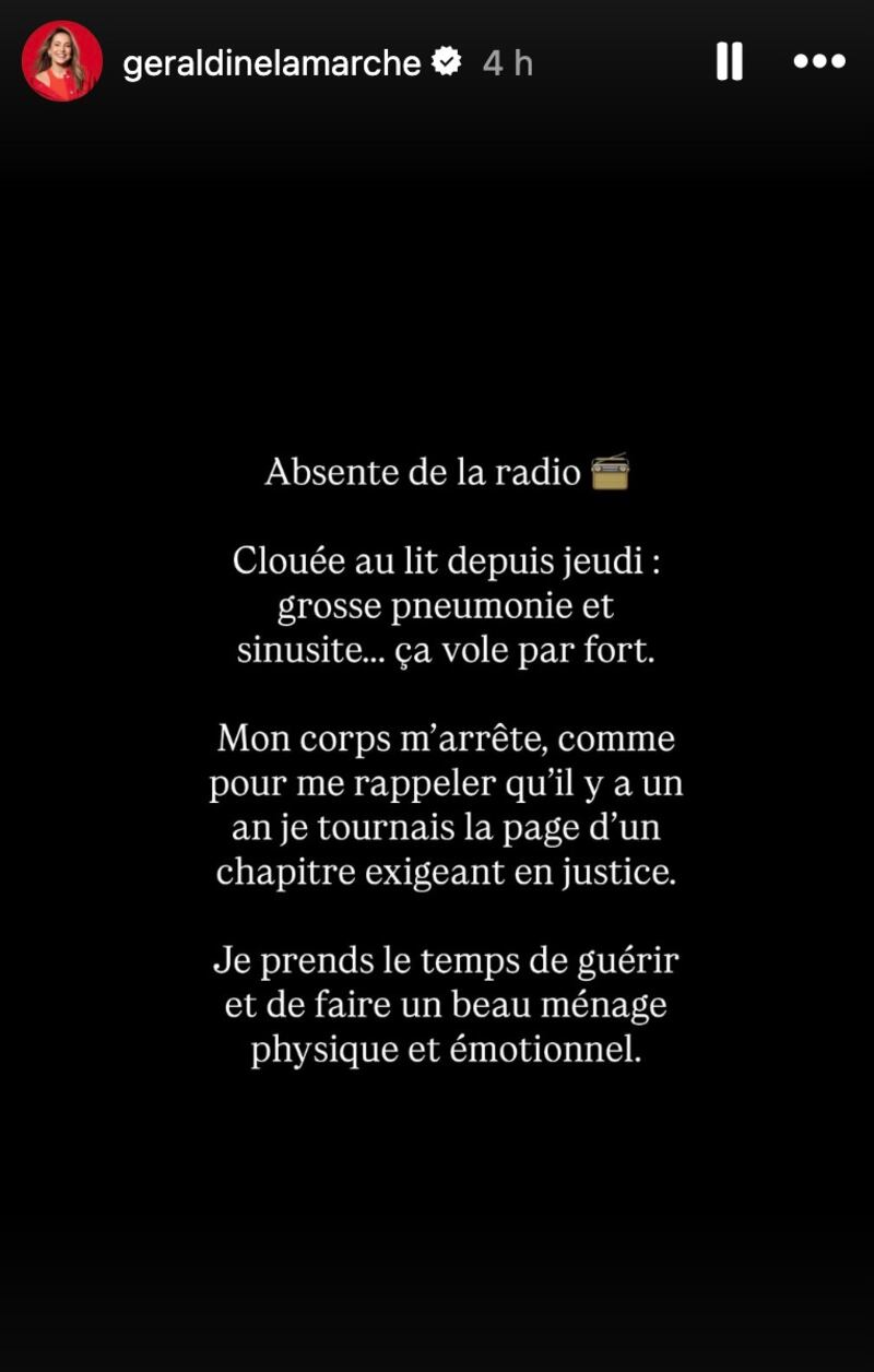 Dans une story Instagram, Géraldine Lamarche a expliqué qu'elle est «clouée au lit depuis jeudi». Elle se repose et met son énergie sur sa guérison. Cela explique pourquoi elle est absente de la radio cette semaine.