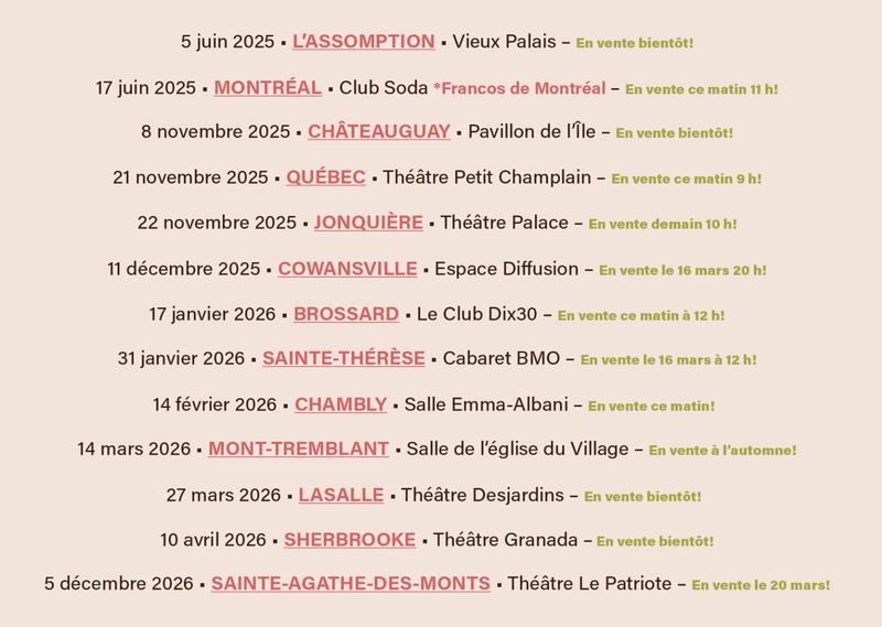Ceux qui veulent découvrir cette nouvelle facette de l’artiste en spectacle pourront la voir sur scène le 5 juin à L’Assomption, le 17 juin au Club Soda à Montréal, le 8 novembre à Châteauguay et le 21 novembre à Québec, au Théâtre Petit Champlain.