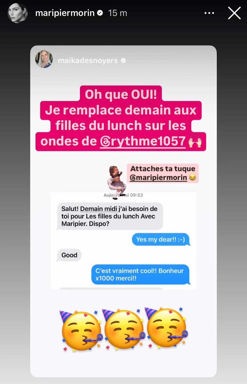 Dans sa story Instagram, Maripier Morin a dévoilé qui s'installera à ses côtés, ce mercredi à la place de Marie-Eve Janvier.
