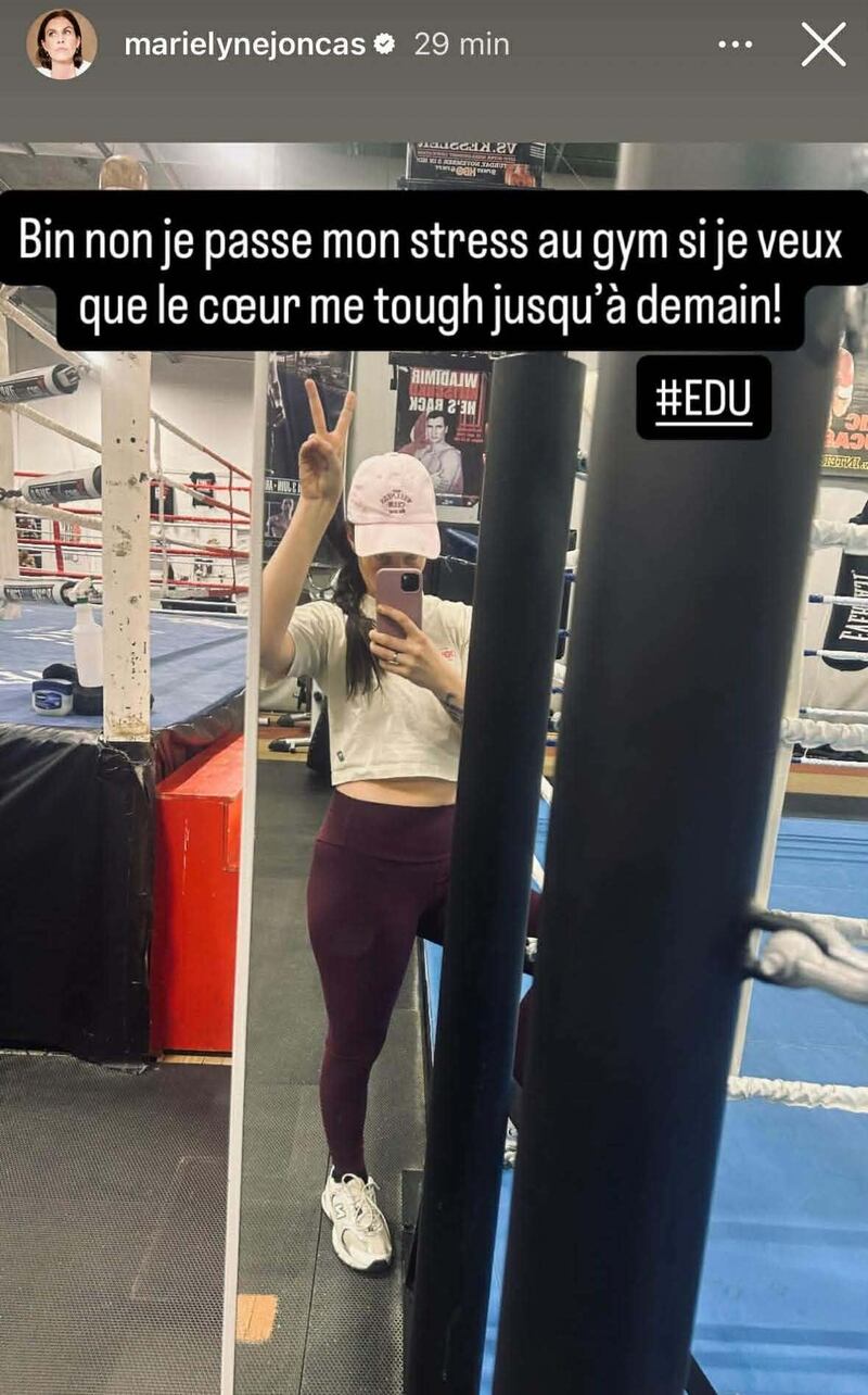 Dans une série de stories publiées sur Instagram, Marie-Lyne Joncas a confié être d'abord allée au gym. Faire du sport lui a permis de se détendre à l'approche de ce moment tant attendu: