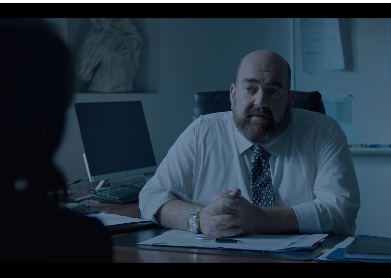 Manuela veut se débarrasser de ses parts pour pouvoir quitter l'entreprise qui est gérée par son agresseur et elle consulte son avocat (Martin Larocque).