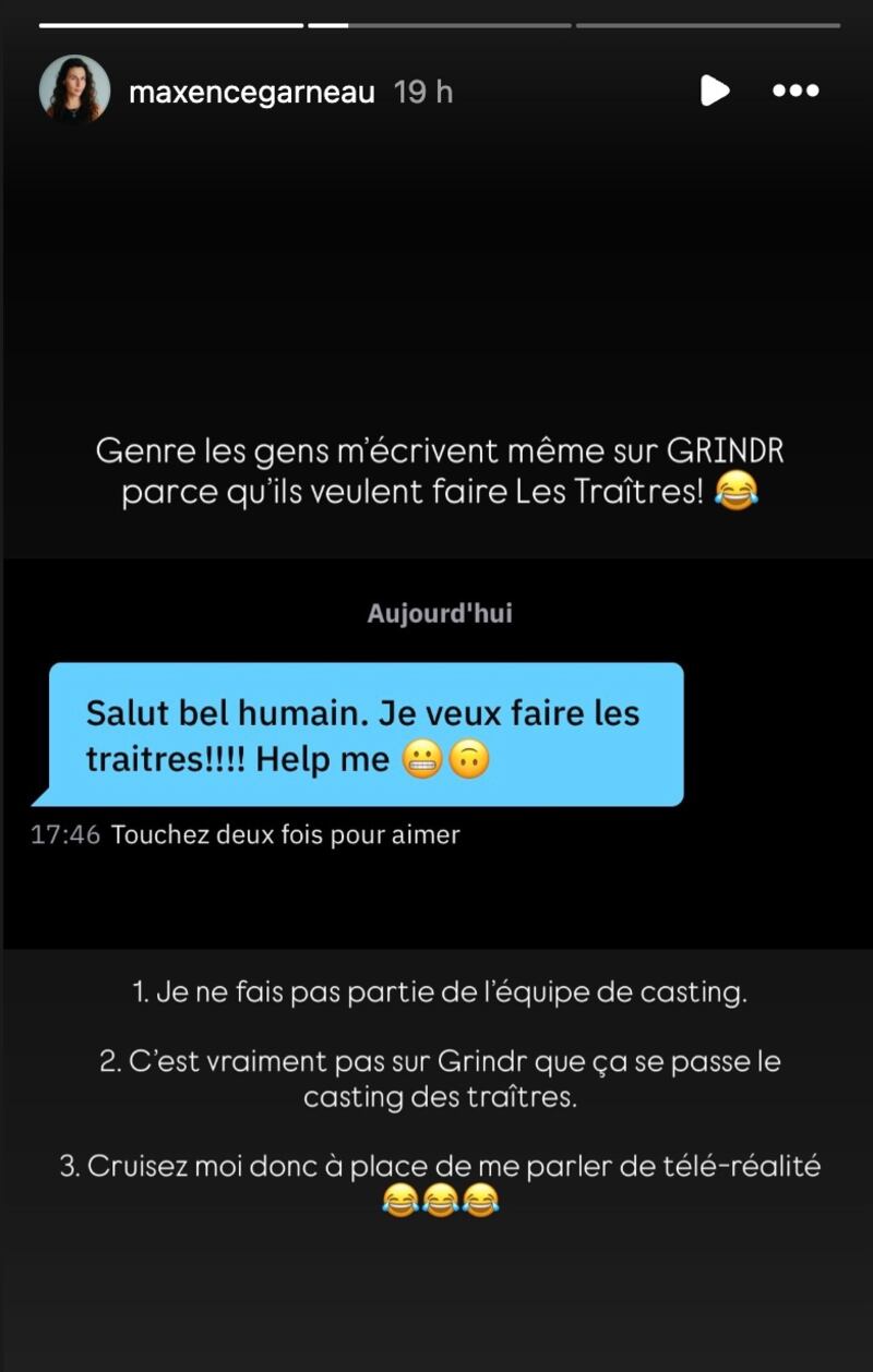 Dans une story Instagram, Maxence Garneau, que le public a découvert dans la première saison des Traîtres, explique recevoir des messages sur les applications de rencontres de personnes qui souhaitent participer à la prochaine saison de l’émission.