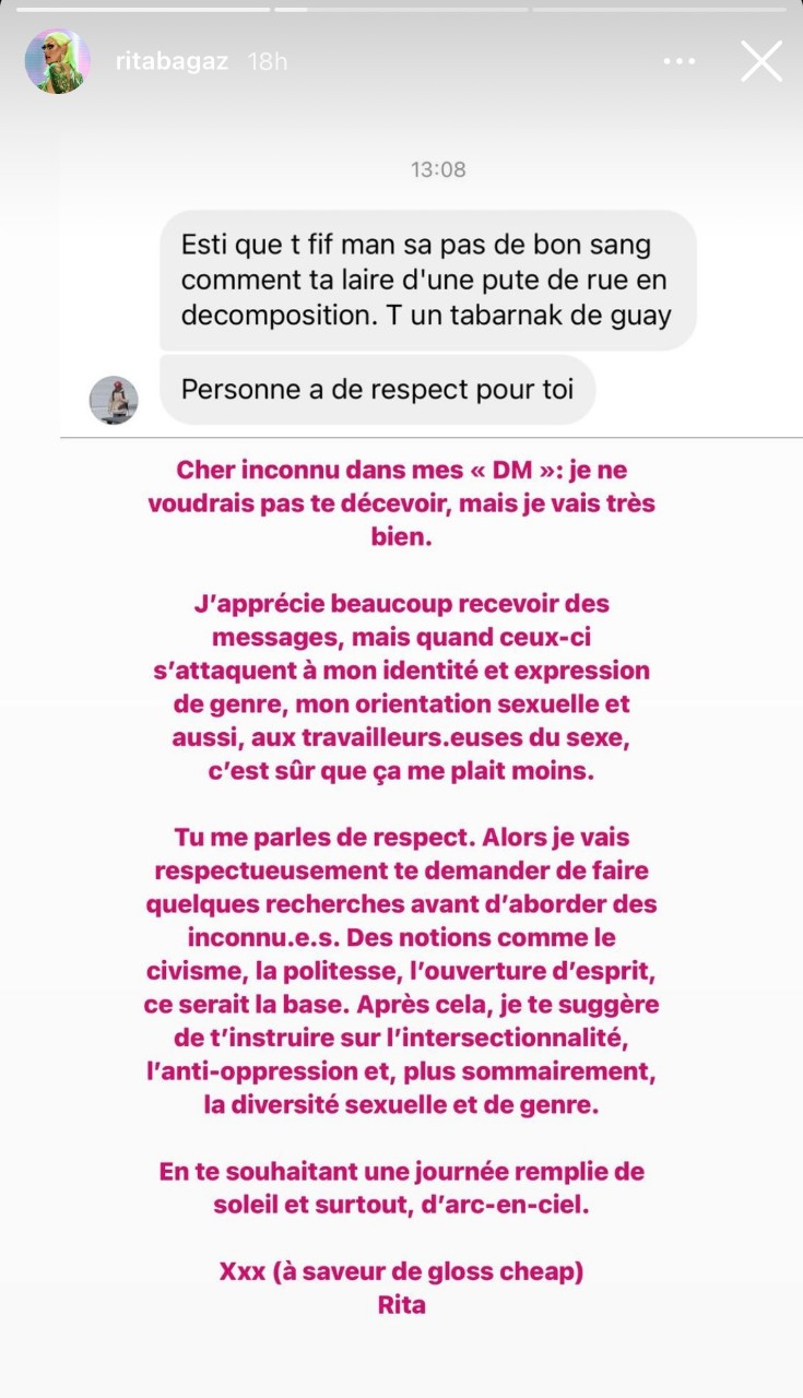 Un message d'une violence inacceptable auquel la populaire drag queen a répondu du tac au tac :