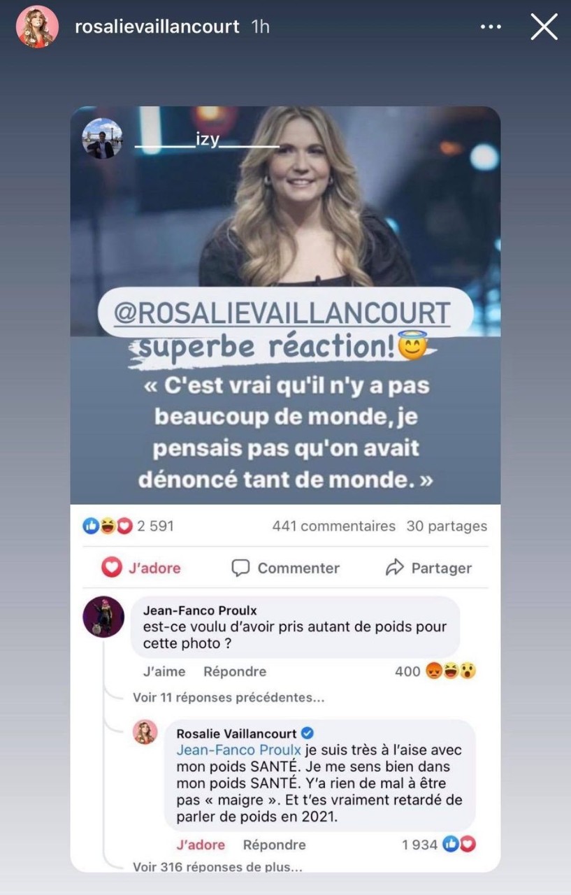 Rosalie Vaillancourt a répondu publiquement à un commentaire négatif sur son poids, hier soir sur les réseaux sociaux!
