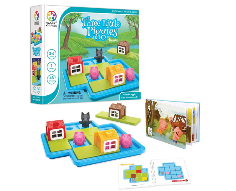 Conçu pour le enfants de 3 à 6 ans, le jeu des 3 petits cochons est un genre de casse-tête logique où l'enfant doit réussir à placer les maisons de façon à ce que les cochons soient en mesure de jouer à l'extérieur sans crainte d'être dévoré par le méchant loup.