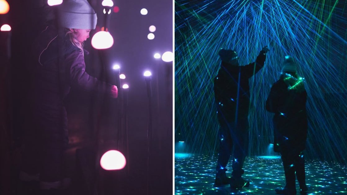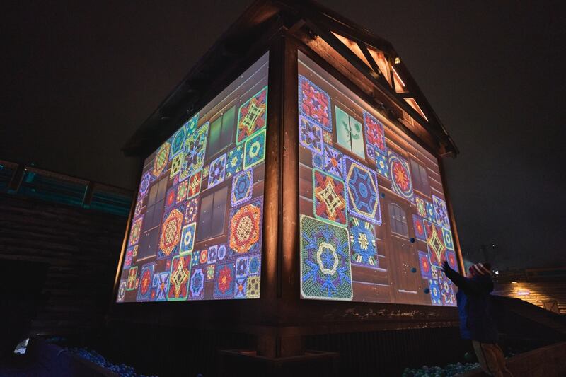 Mention spéciale aux installations interactives, où il est possible de jouer avec les ombres chinoises sur une façade, puis lancer de petites balles sur une projection d’un chalet en bois rond pour y faire apparaître lumières et tricots colorés.