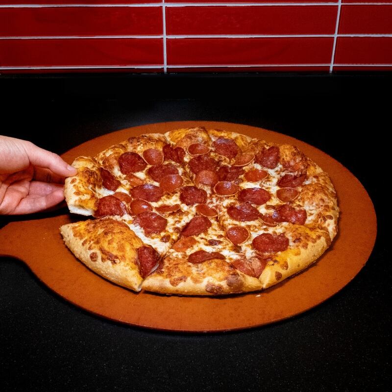 La pizza chaude à croûte artisanale Duo pepperoni ou Aux trois fromages sera remise aux client.e.s dans une nouvelle boîte à pizza.