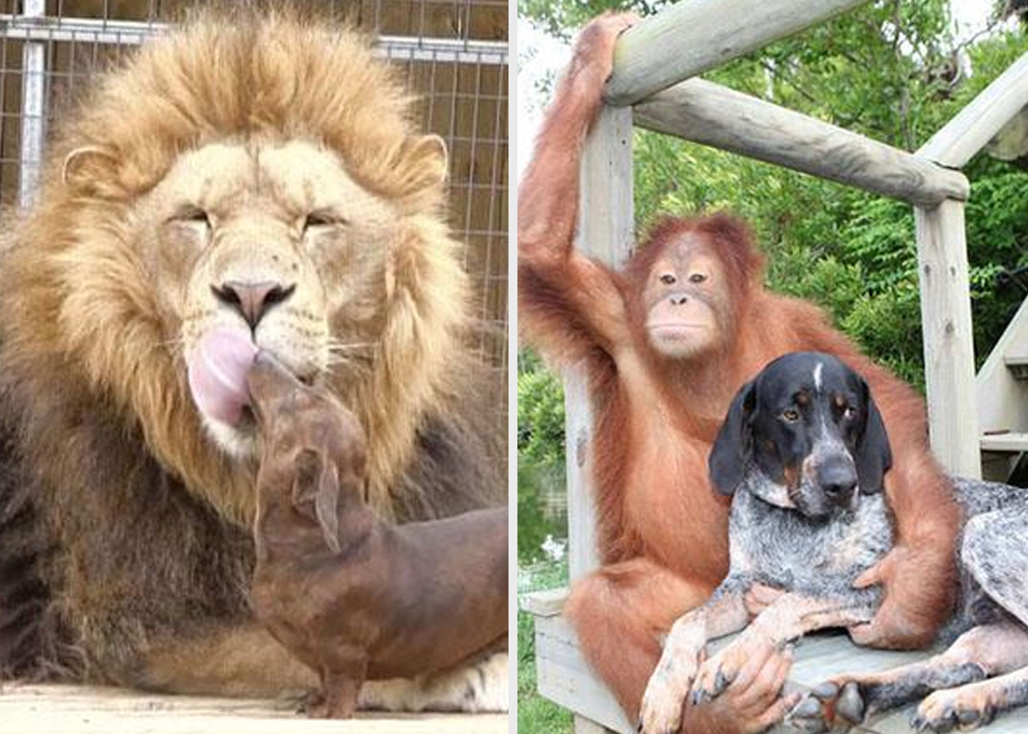 Un lion handicapé et un chien teckel se sont lié d'amitié. Le lionceau, nommé Bonedigger est arrivé bébé au zoo de Wynnewood, en Oklahoma. Comme il avait de la difficulté à marcher, le directeur l'a emmené chez lui, où une portée de teckels venait de naître. Milo est maintenant rendu à 11 livres et Bonedigger pèse maintenant 500 livres. Mais cela ne leur a pas empêché de devenir les meilleurs amis du monde. Le lionceau, qui a grandi avec Milo, lui fait régulièrement sa toilette et ils sont inséparables depuis déjà plusieurs années!