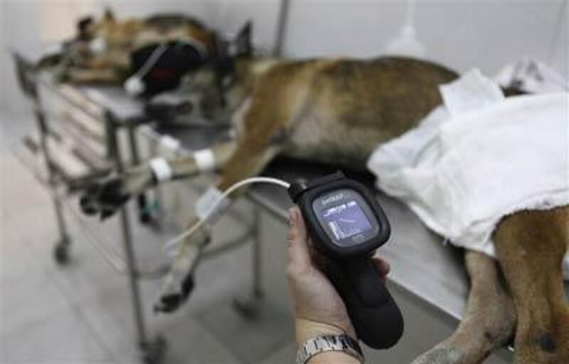 Le vétérinaire examine la pression artérielle d'un chien à l'hôpital Anclivepa-SP.