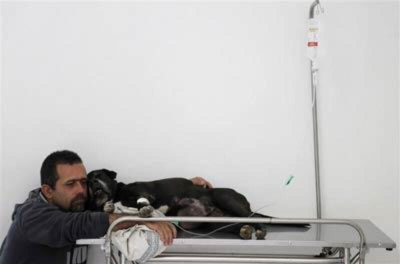 Un homme embrasse affectueusement son chien pendant que celui-ci reçoit une solution saline, à l'hôpital Anclivepa-SP.