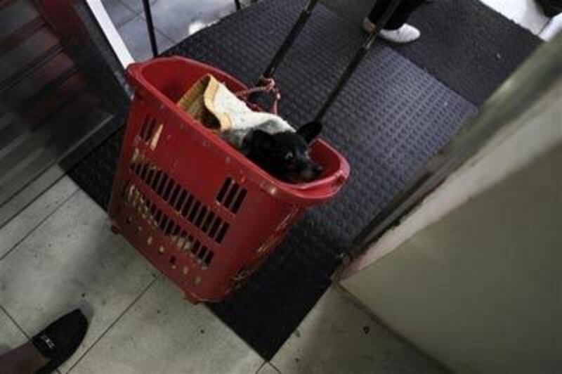 Une femme installe son chien dans un chariot d'épicerie après son rendez-vous médical.