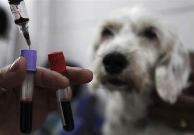 Un vétérinaire rempli les tubes de sang du petit chien qu'il examine.