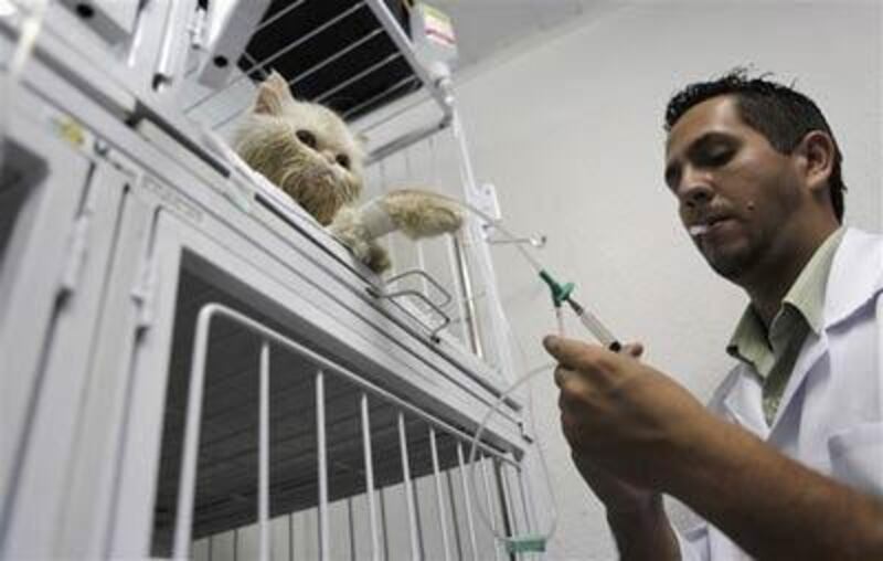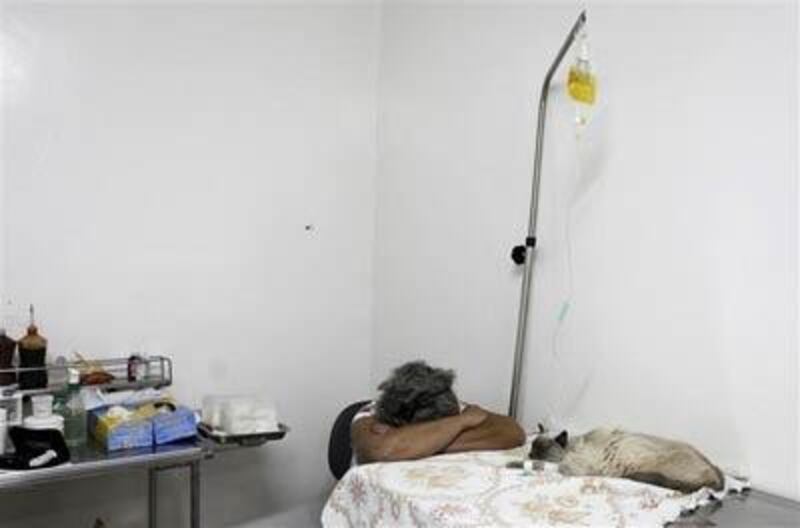 L'assistant du vétérinaire se prépare à donner une injection de solution saline à un chat, à l'hôpital Anclivepa-SP.