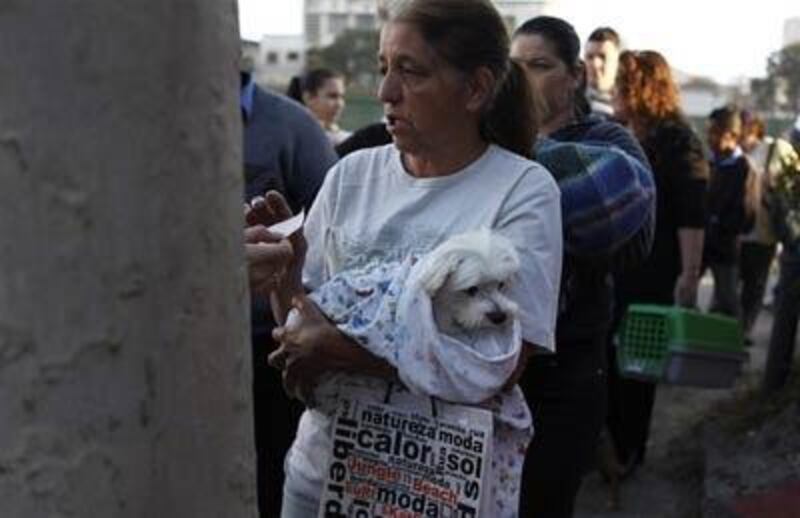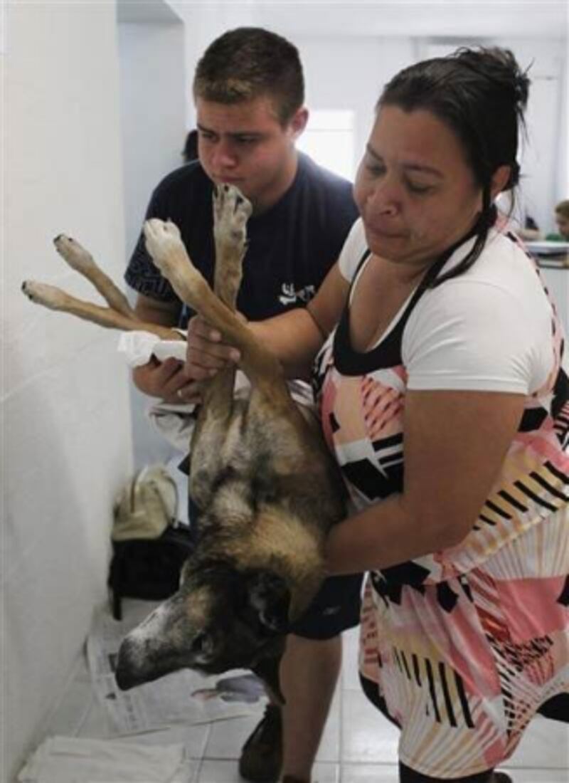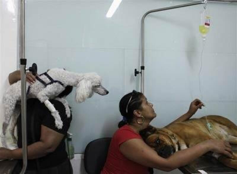 Une femme et son fils transportent leur chien pour un examen médical à l'hôpital vétérinaire Anclivepa-SP, à Sao Paolo.