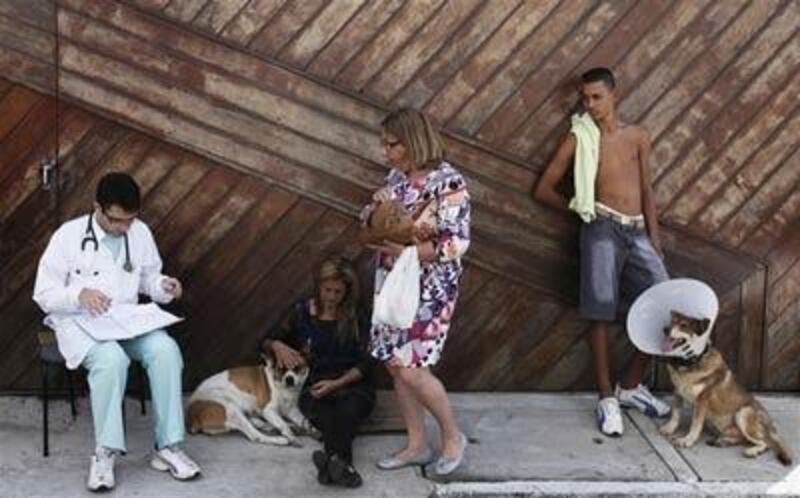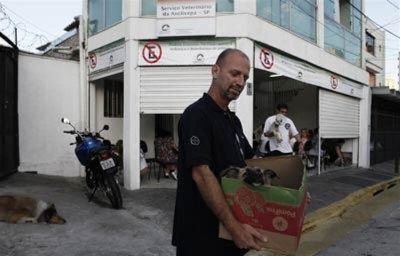 Un vétérinaire parle avec des propriétaires d'animaux à l'extérieur de l'hôpital vétérinaire Anclivega-SP, ouvert en 2012. Cet hôpital est financé par le gouvernement municipal de Sao Paolo (Brésil) et offre des soins gratuits aux animaux de compagnie de familles à faible revenu. La ville de Sao Paolo compte plus de 3 millions d'animaux de compagnie selon les statistiques gouvernementales. C'est pourquoi le maire de Sao Paolo a décidé de venir en aide aux familles pauvres.