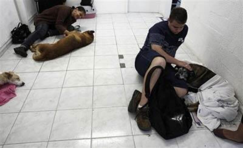 Les gens font la queue avec leurs animaux à l'extérieur de l'hôpital vétérinaire qui donne des soins gratuis aux animaux de compagnie de familles pauvres.