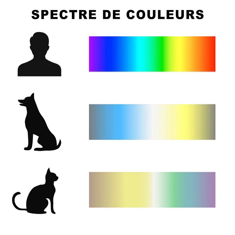 La vision des couleurs chez l'homme est trichromatique, c'est-à-dire que nous les humains, possédons trois types de cônes sensibles à la couleur, ce qui nous permet de voir une large gamme de couleurs. Celle du chien et du chat est dichromatique.