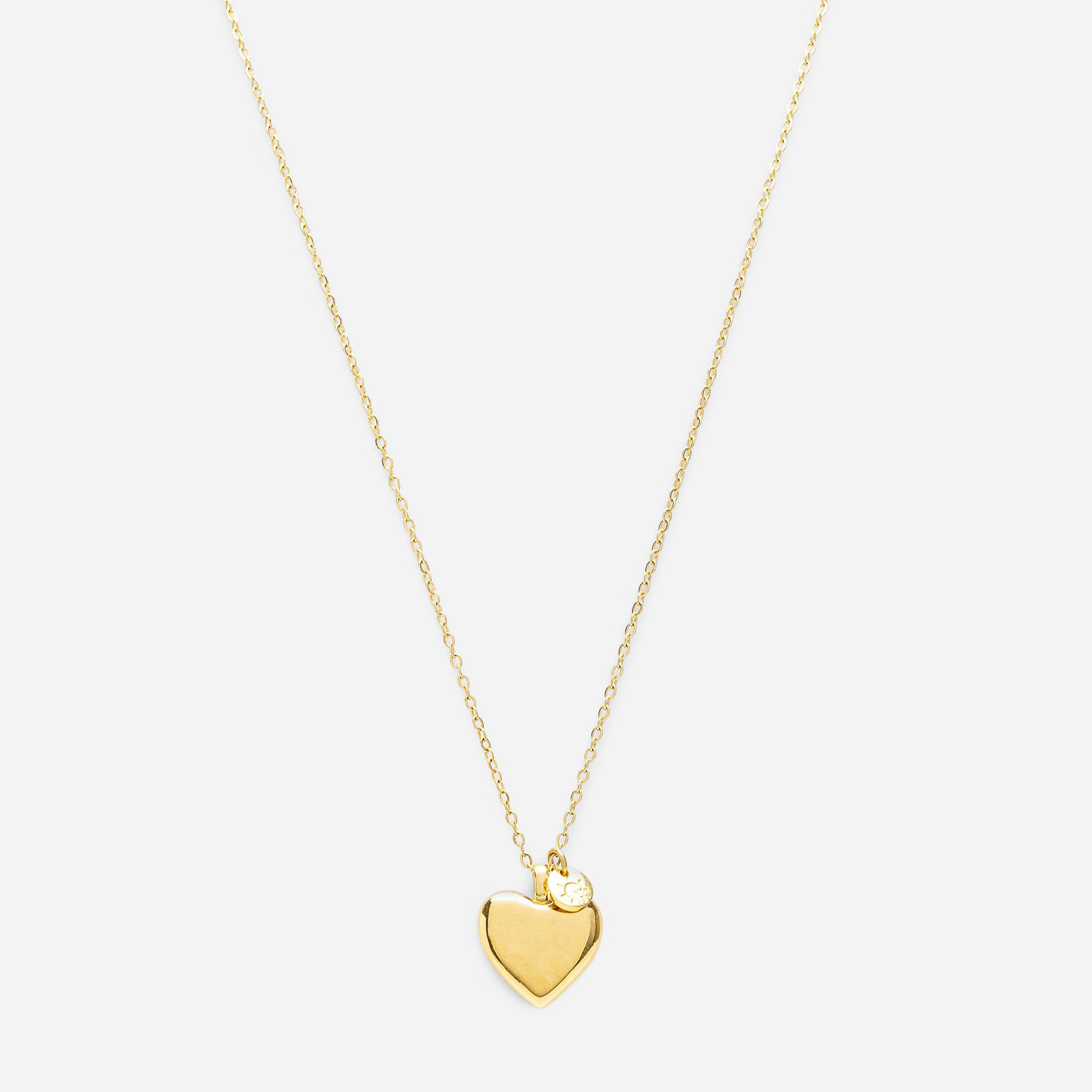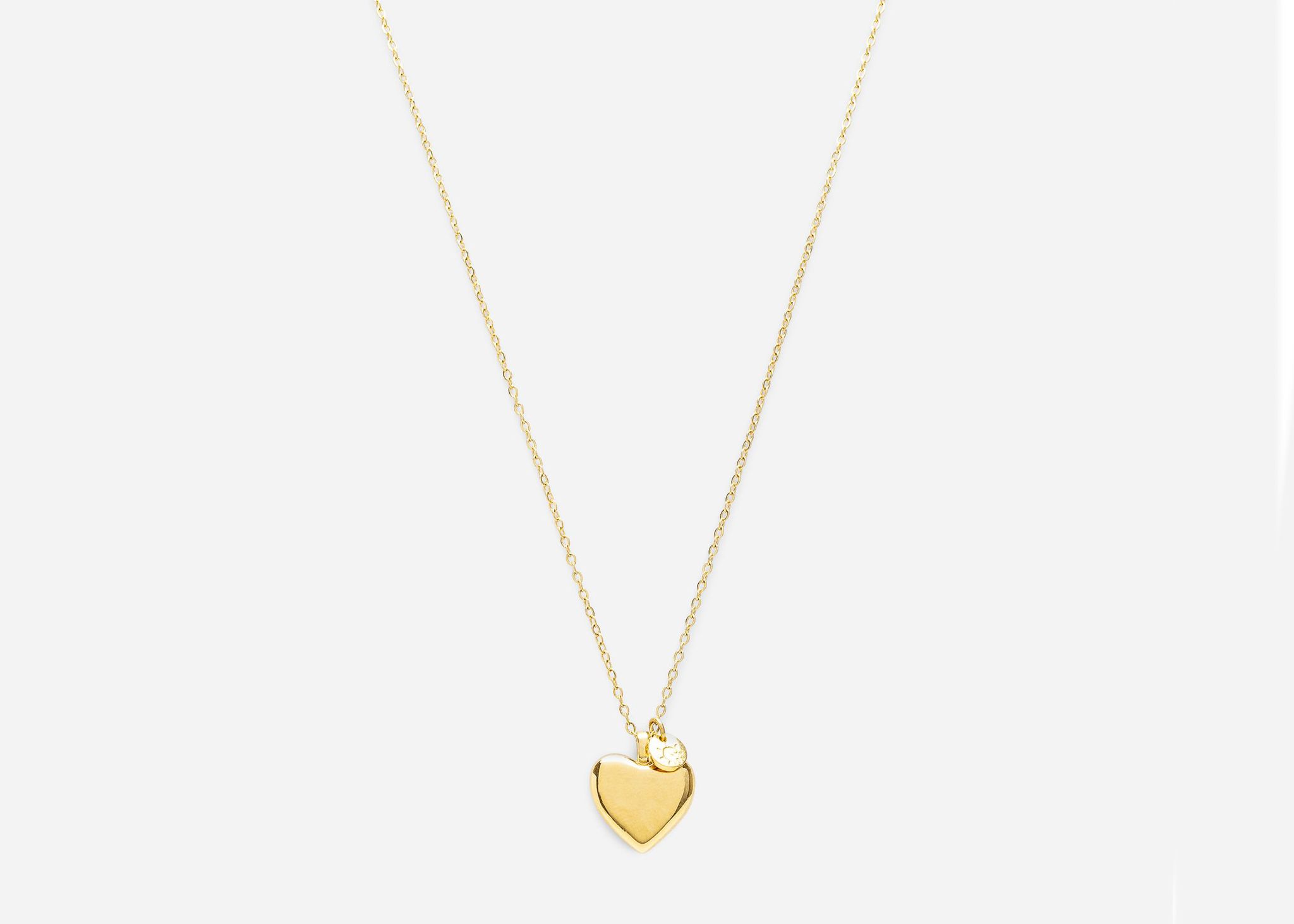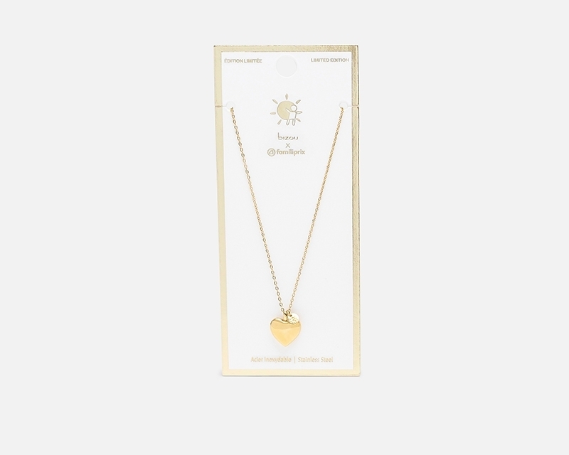 Le collier consiste en une chaîne en acier inoxydable de couleur dorée, avec deux ornements : un coeur et un mini-pendentif à motif de soleil.