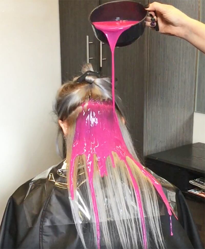 La teinture est diluée avec 80% d’eau afin de permettre à la couleur de bien couler sur la chevelure. De cette façon, on s'assure qu’on n’a pas seulement le dessus de la tête de teinte, mais bien de belles lignes limpides de haut en bas.