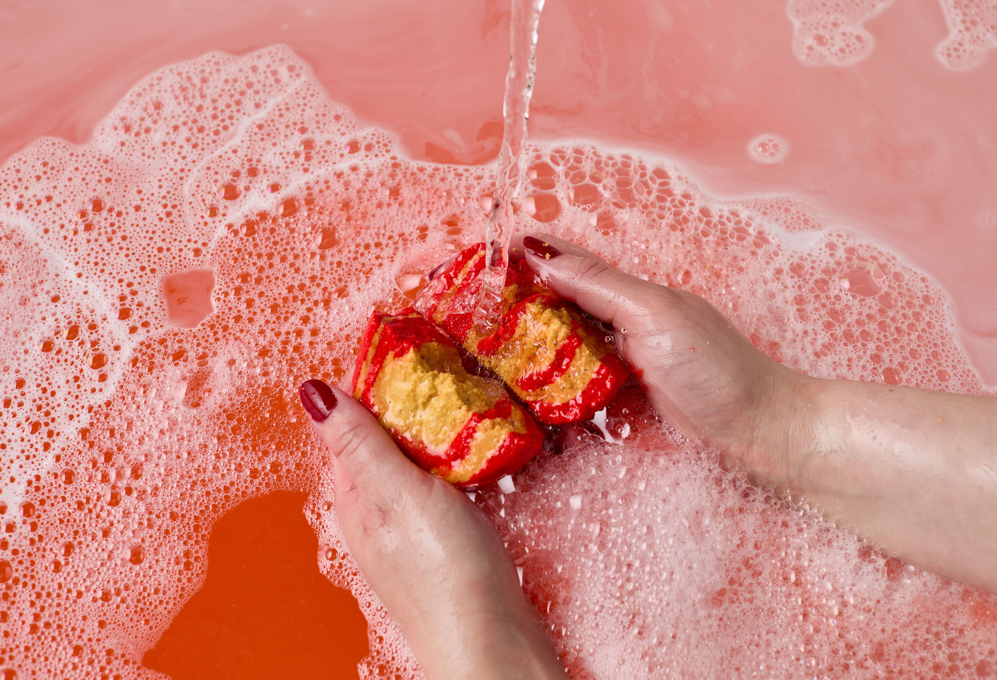 Placez ce tourbillon rouge et or sous le le jet d’eau pour créer des tonnes de bulles duveteuses. Votre bain aura des effluves de néroli, de feuilles de cannelier et d'huile de gingembre, rappelant les biscuits de pain d'épices.