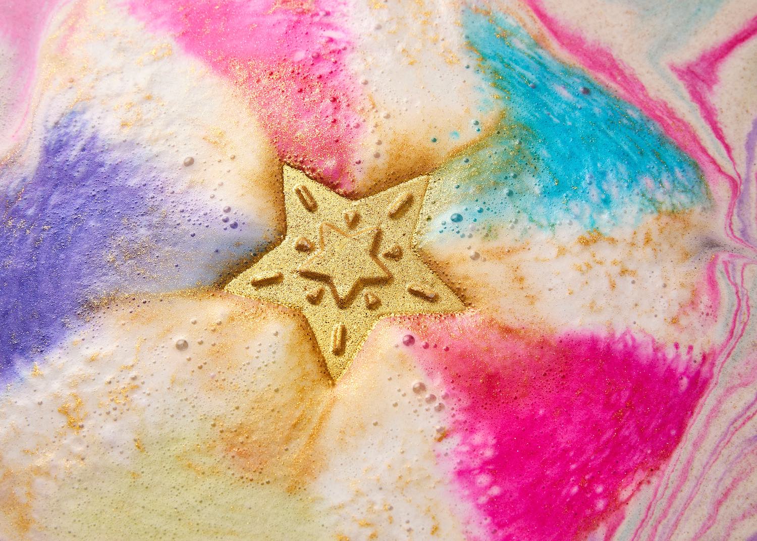 Cette bombe de bain crée un arc-en-ciel de couleurs dans l'eau du bain tout en laissant une mousse crémeuse. Cette étoile dorée a un parfum doux et mentholé de vanille, de menthe poivrée et d'un soupçon de chocolat. De plus, la poudre de lait de coco apaise et hydrate la peau.