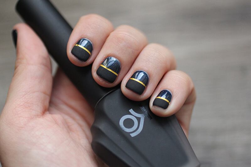 On joue sur les contrastes avec ce vernis noir à la fois mat et lustré, séparé par une ligne dorée.