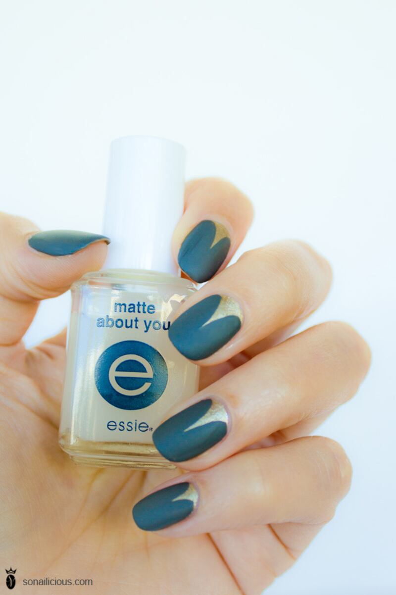 Avec un peu de doré, ce vernis bleu mat prend tout de suite une touche festive.
